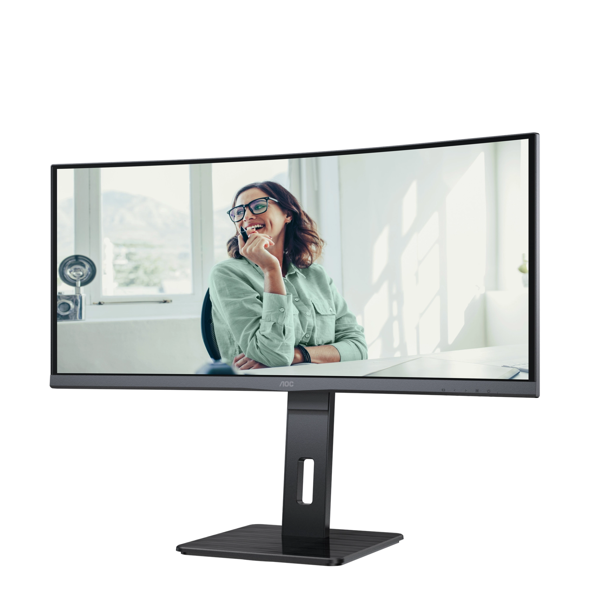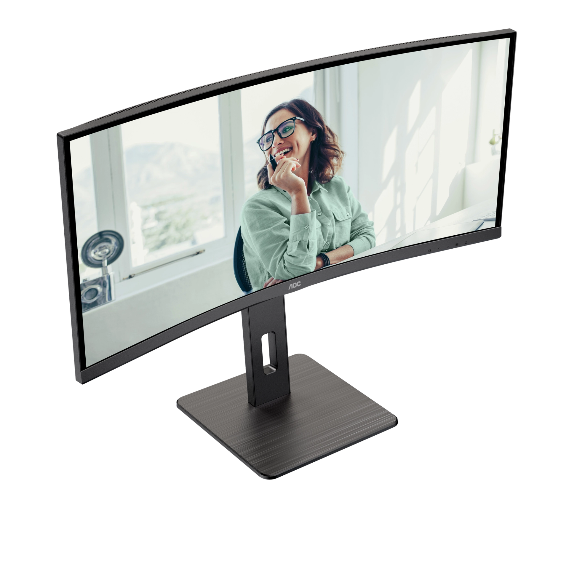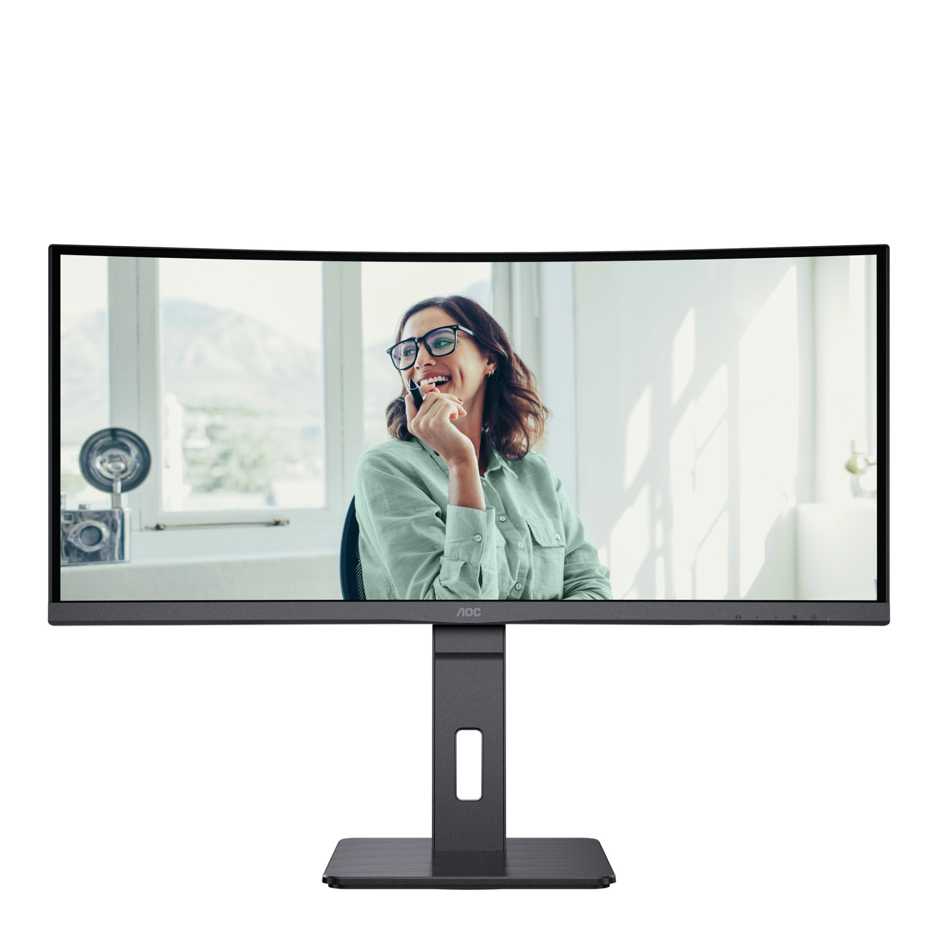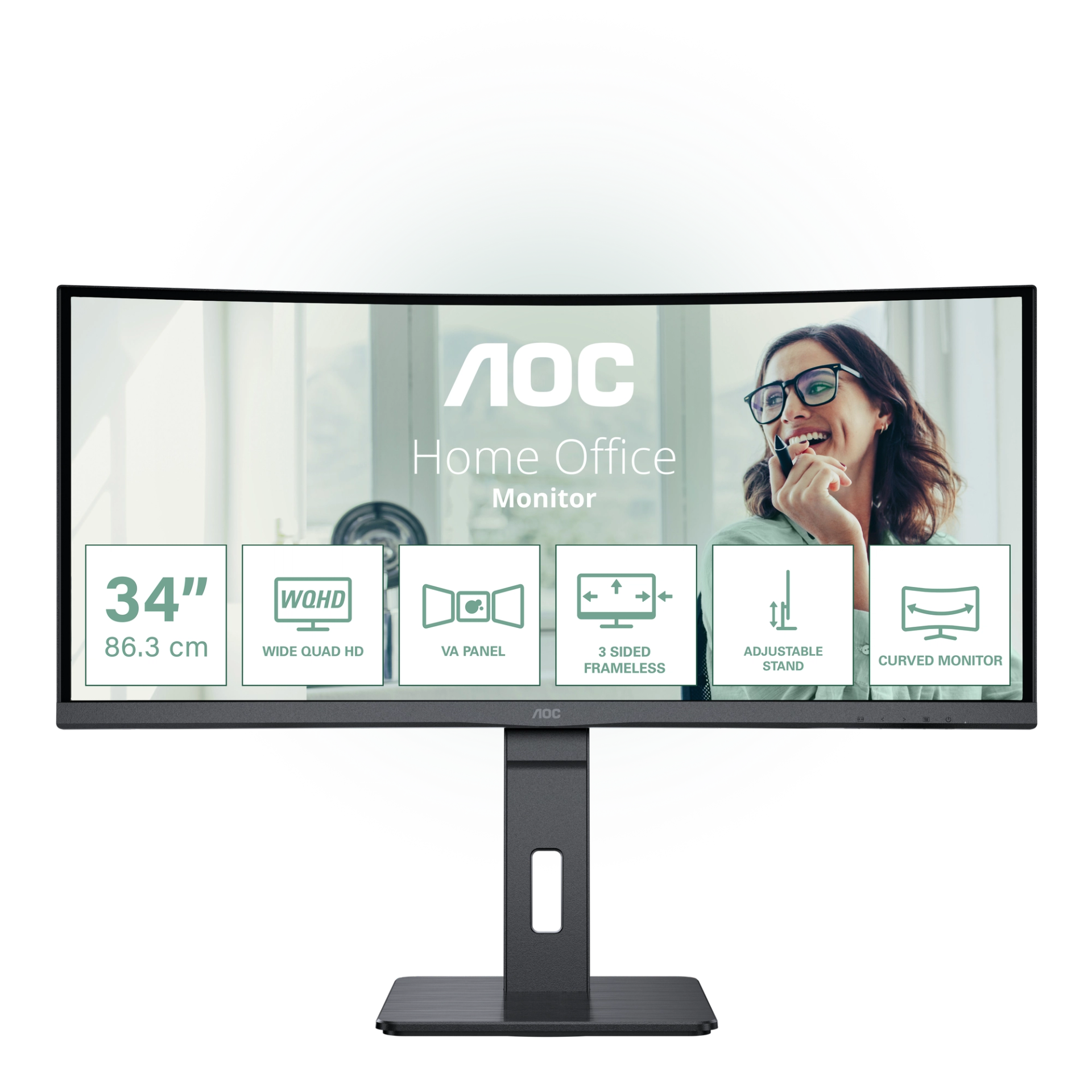 The AOC CU34P3CV is a 34" WOHD (3440 × 1440) curved VA screen with an attractive three-sided ultrathin bezel design that offers truly immersive viewing. This model's Wide QHD 21:9 aspect ratio expands your field of vision while providing a wrap-around view for an enhanced cinematic experience. The panel features 300-nit brightness and generous 178/178° wide viewing angles, along with two built-in 5W + 5W speakers to enhance your daily productivity in today's Wxible office. Monitor CU34P3CV is ready to boost your productivity with USB-C supporting Power Delivery up to 65W, data transfer and DP-alt mode. Connectivity of this monitor is enhanced with USB Hub and RJ-45. Keeping sustainability in mind, an array of environmental certifications including EPA, TCO, and EPEAT complete this monitor.